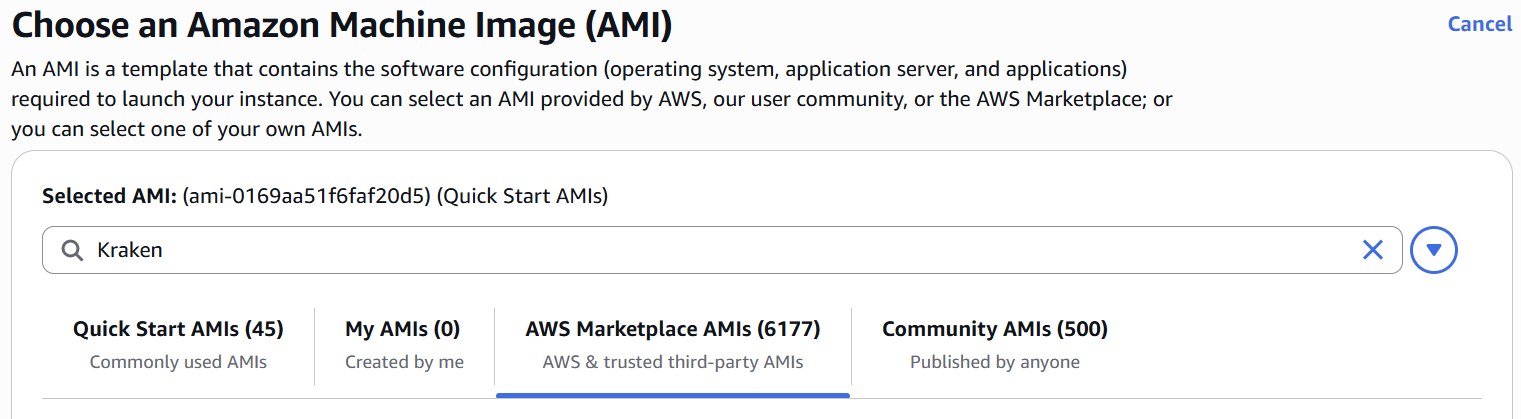 Select AWS Marketplace AMIs, then type "Kraken" into the search bar and press Enter.