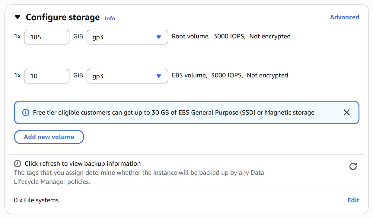 In the Configure Storage section, the amount of storage space is automatically set to the minimum required storage space for the Kraken instance (1x185GB and 1x10GB).