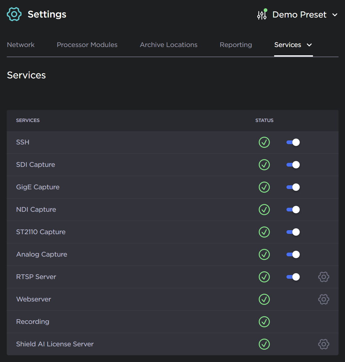 Enable and disable network or input capture services, including SDI (DeckLink) Capture, GigE Capture, NDI Capture, ST2110 Capture, Analog (V4L2) Capture, RTSP and SSH,