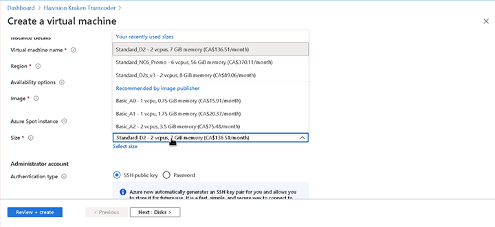 Size should be based on the considerations of performance, space and pricing. For recommendations on sizing, see https://azuremarketplace.microsoft.com/en-us/marketplace/apps/haivisionsystemsinc1580780591922.haivision-kraken?tab=PlansAndPrice.