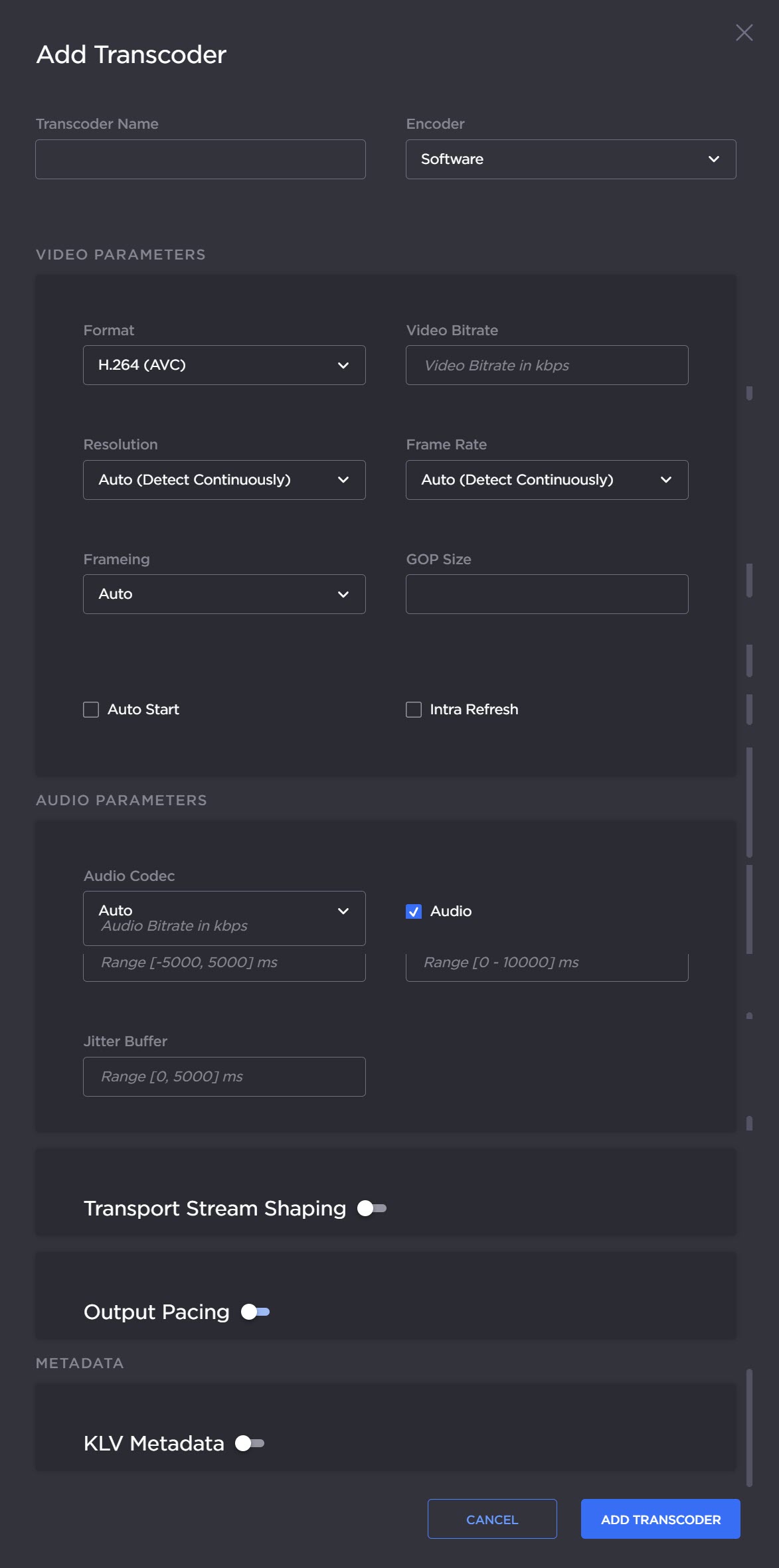 - Click the Add Transcoder button. The Add Transcoder panel opens: