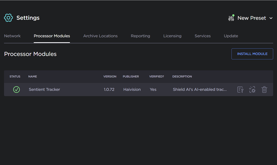 If you are installing the Shield AI Tracker Processor Module (using Shield AI's Tracker algorithm), you must have the Sentient Tracker license installed. For details on licensing, see Licensing Your Kraken.