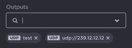 Output | Select the output(s) for the transcoded or bypassed stream. Applied outputs appear as tags below the Output field. ![]() When configuring steam outputs, you can: