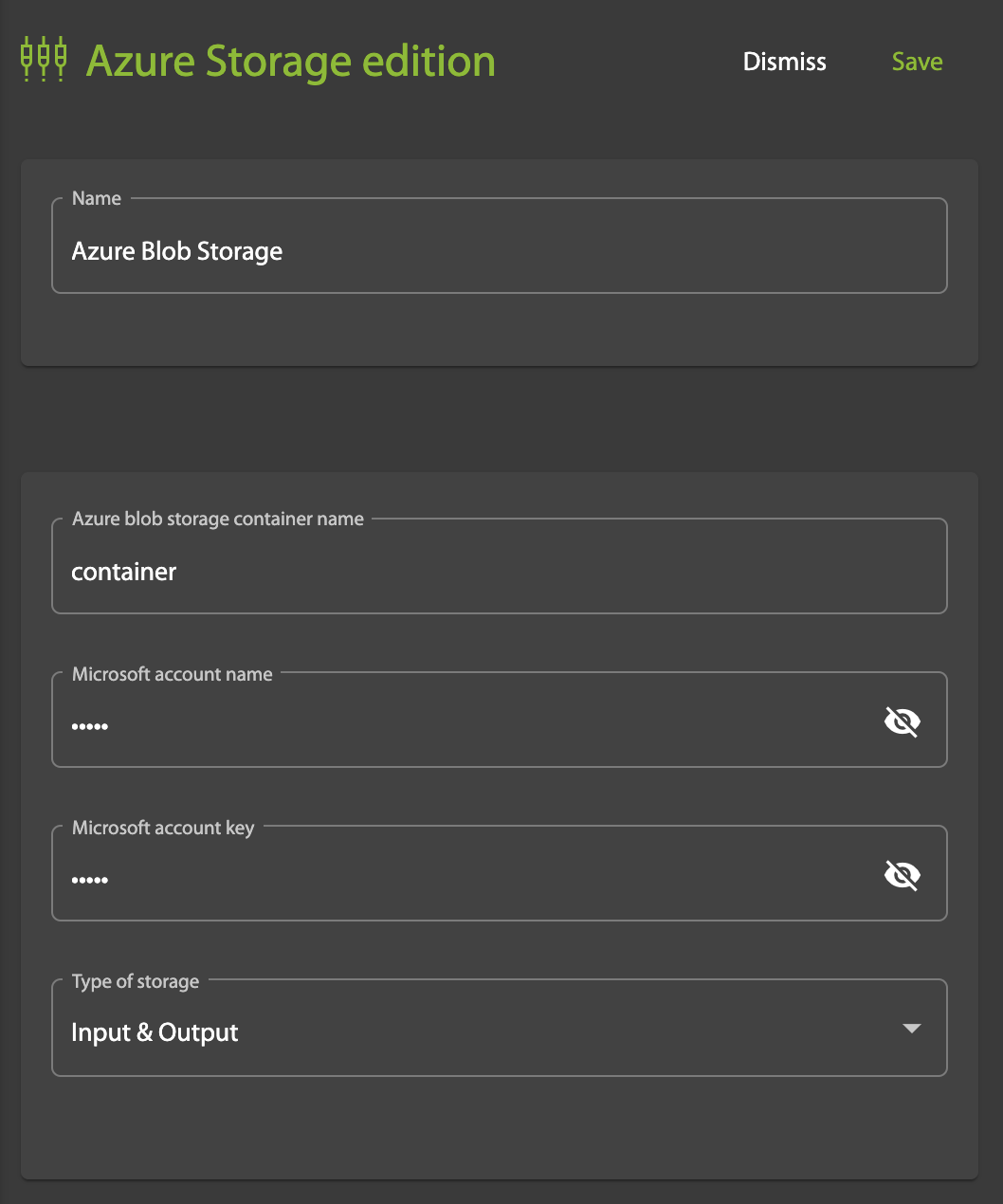 - Azure blob storage container name: Azure bucket name