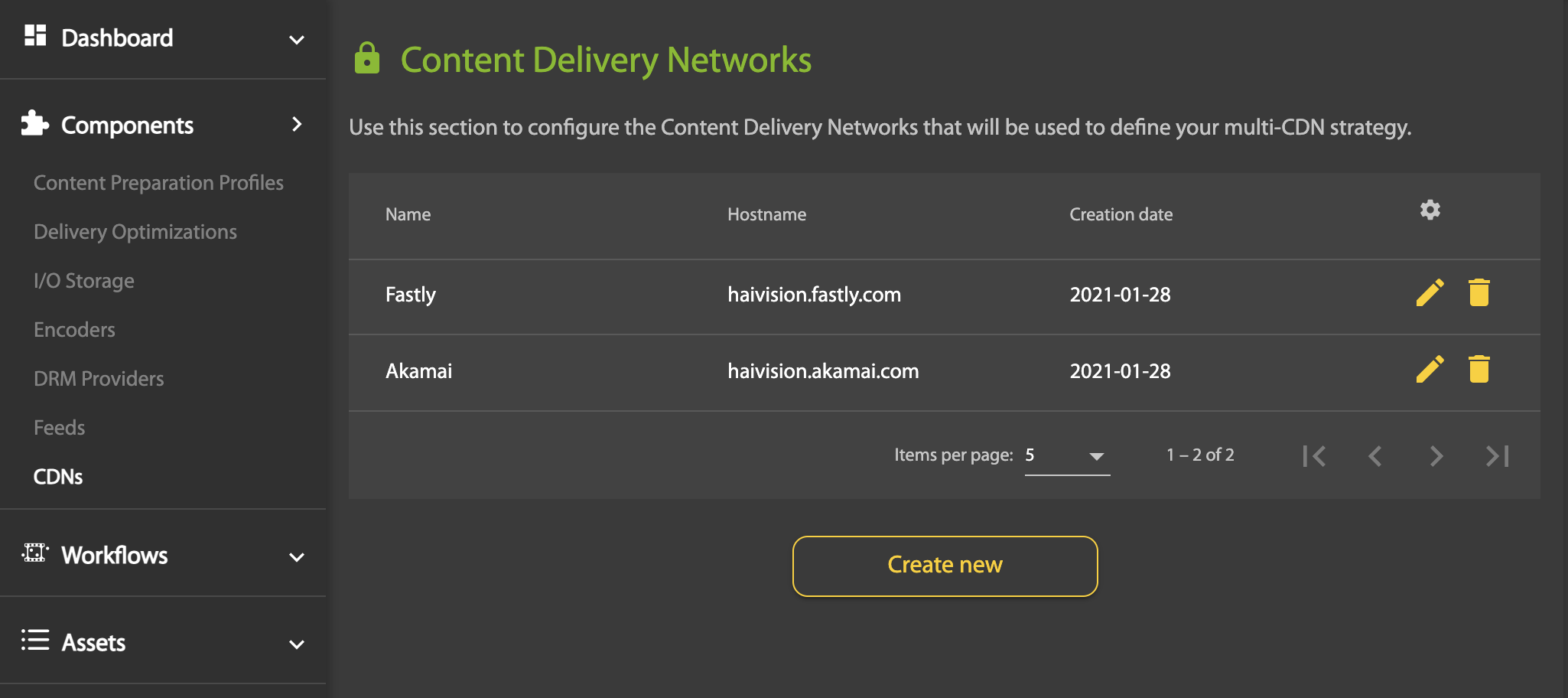 - To create a new CDN, click on the Create new button, and then enter the following information: