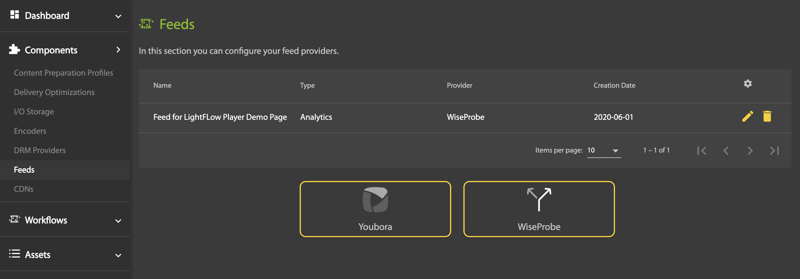 - To define a player analytics feed, click on the icon corresponding to the provider you wish to configure. The following providers are supported: