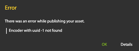 You can monitor the progress of an asset as it is being published on the Asset Monitoring page. If an error occurs, the word ERROR appears under the Status column. Click it to view details at the bottom of the page:
