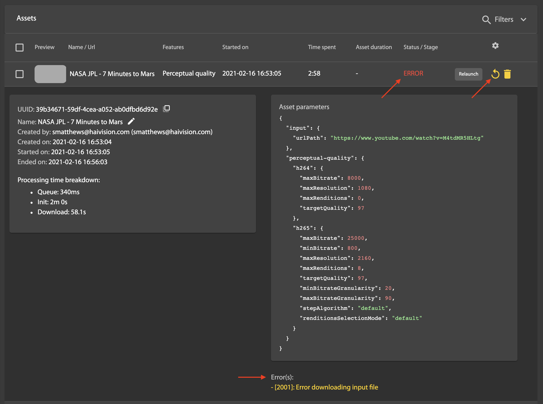 Note that in the case of a transient error, such as a network outage that has been resolved, you can click on the Relaunch button to try again.