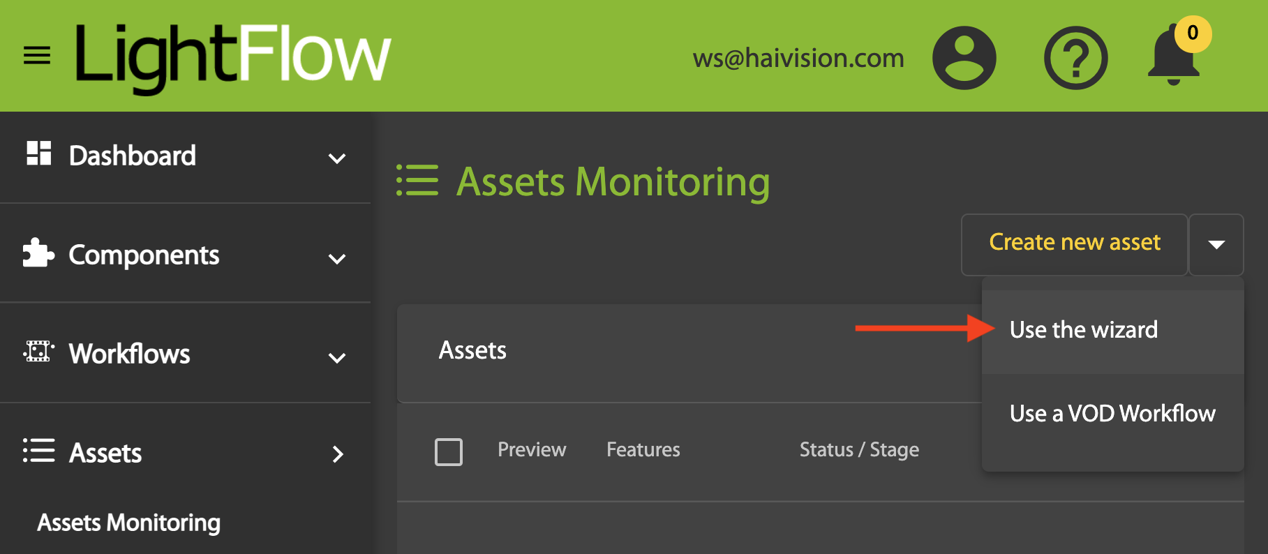 In LightFlow, an asset is a video, including the output formats used to watch it online or offline, and the set of optimizations applied to maximize the viewer's quality of experience (QoE). The easiest way to publish a video asset using the LightFlow portal is to choose Use the wizard from the Create a new asset menu in the Assets Monitoring section: