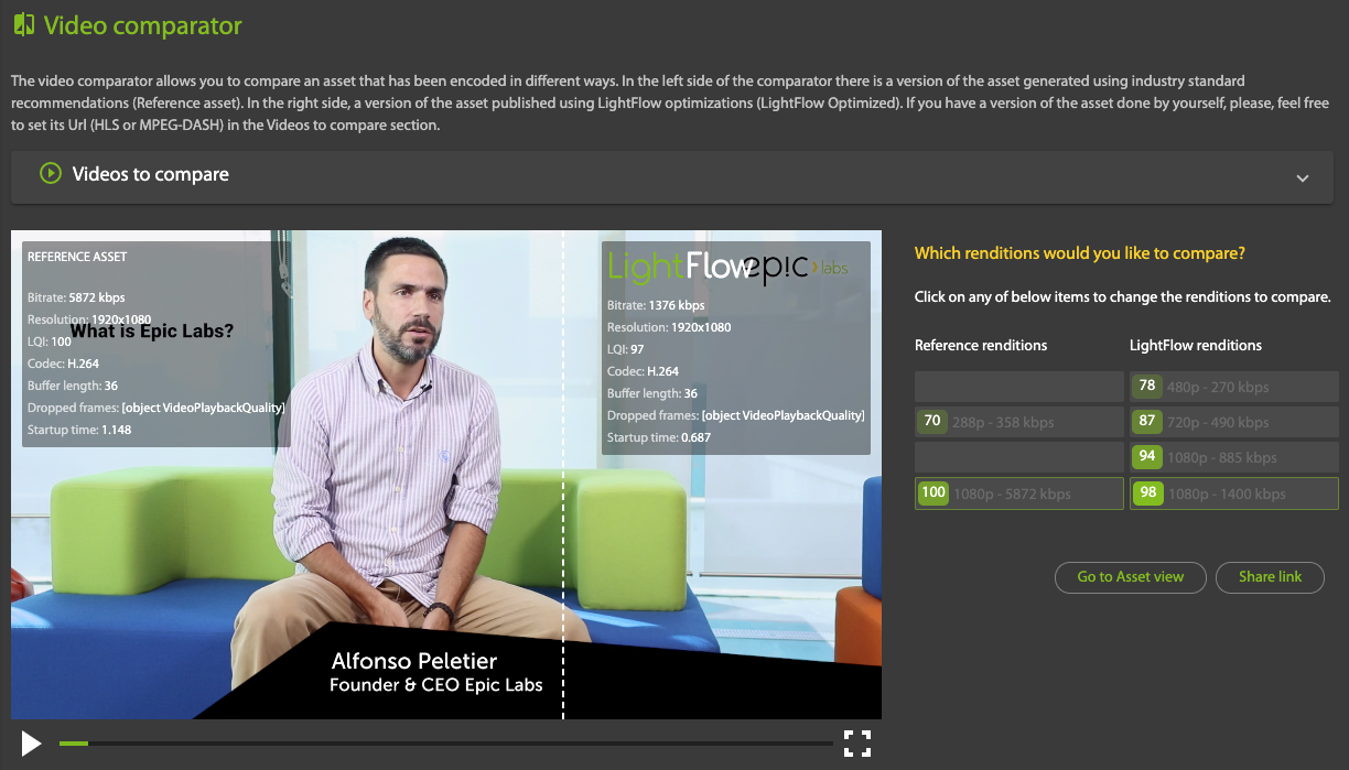 The video comparator allows you to compare an asset that has been encoded in different ways. On the left side of the comparator there is a version of the asset generated using industry standard recommendations (the Reference asset asset). On the right side is a version of the asset published using LightFlow optimizations (LightFlow optimized). The video comparator player lets you compare regions of the LightFlow processed video against the reference video by moving a slider back and forth. You might, for example, see that the quality of a reference video at 5 megabits per second is indistinguishable from the LightFlow version at a fraction of the bitrate. This can translate to significant savings in CDN distribution costs.