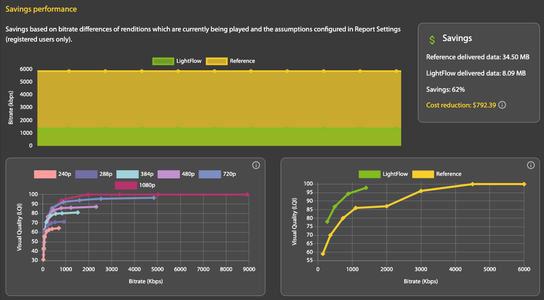 The reference ladder is also used to estimate savings. Based on the information you provide under Settings, LightFlow can calculate very specific storage savings. For CDNs LightFlow has to make a number of assumptions, such as how many times the video will be requested and played, but will give an order of magnitude estimate of the expected savings if you are using the optimized LightFlow settings instead of your current reference settings.