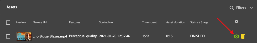 Alternatively, you can view the video (together with an analysis of the video output quality) by clicking on the view icon in the Assets Monitoring section of the LightFlow portal.