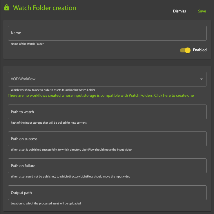 On the Watch Folder creation page, make sure Enabled is toggled to ON, and enter the following information:
