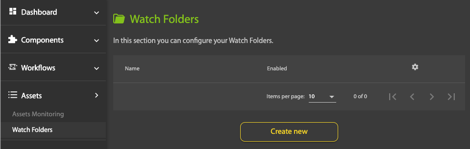 To configure a Watch folder, click Create new on the Watch Folders page:
