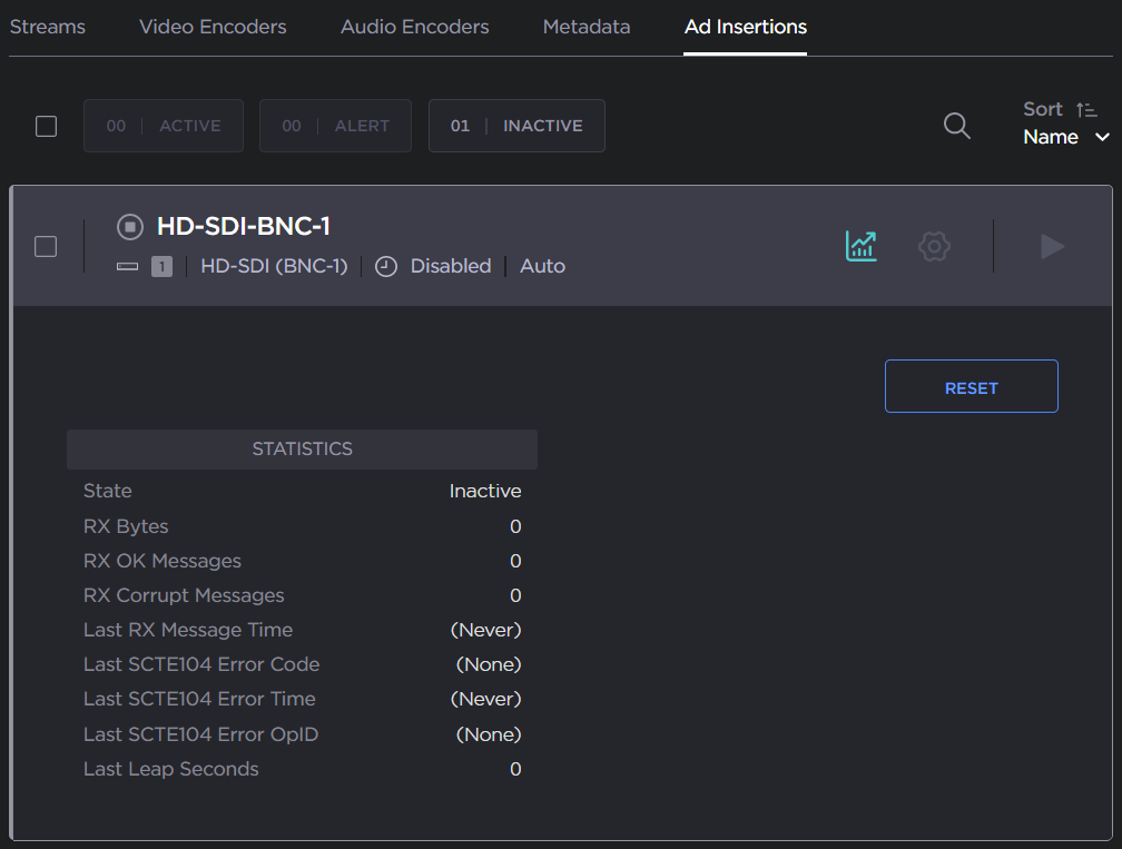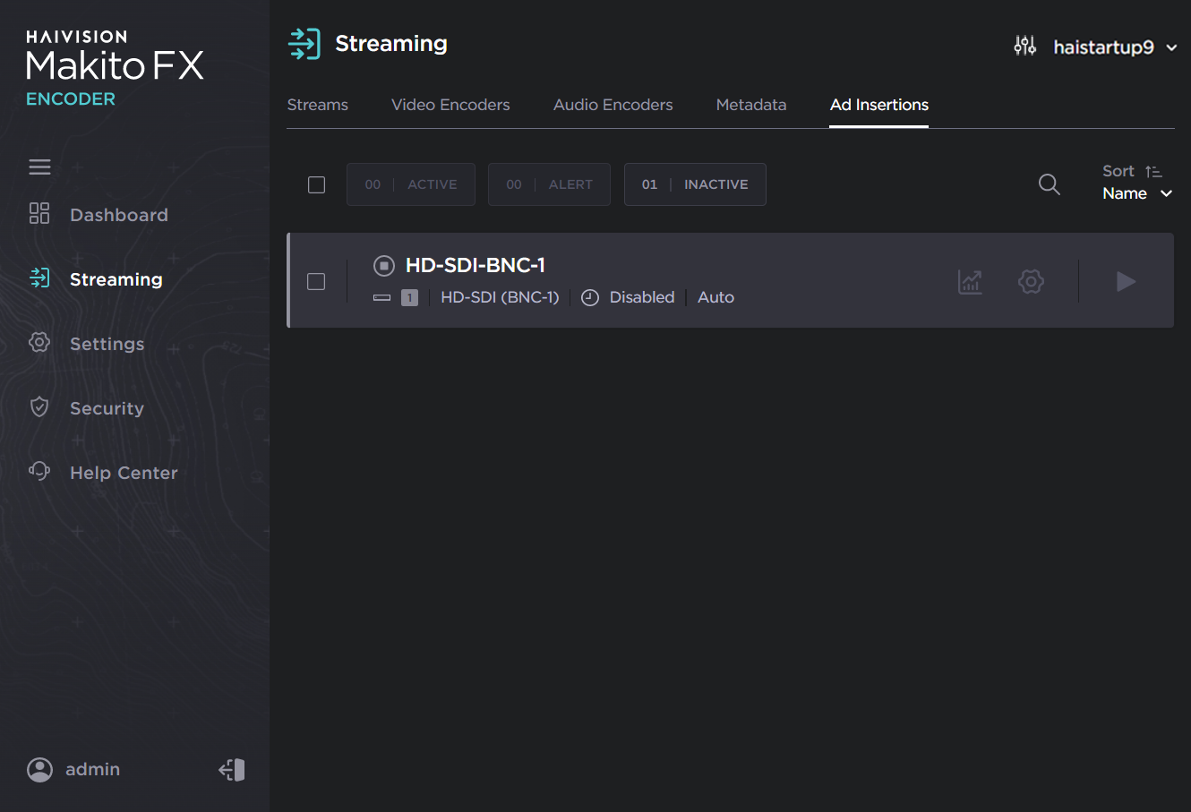 Click Streaming on the sidebar, and select the Ad Insertions tab. The Ad Insertions list view opens, displaying the list of ad sources: The Ad Insertions list view displays the name,type, timing, synchronization mode, and status of each ad source.