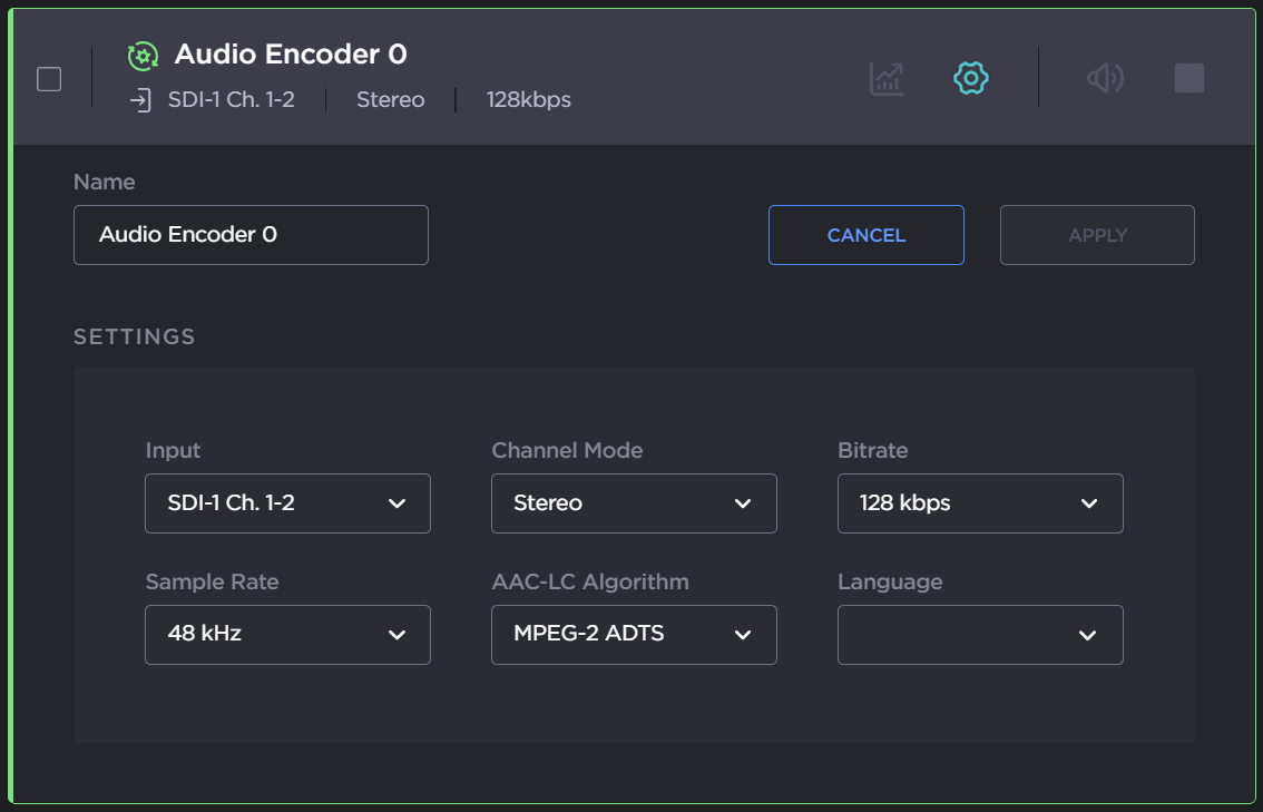 From the Audio Encoders List View, click the Settings icon in the audio encoder panel you wish to modify. The Audio Encoder Detail View opens, displaying the current audio settings for the selected encoder.
