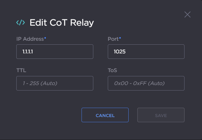 On the Add CoT Relay dialog, enter the IP Address and Port for the destination.