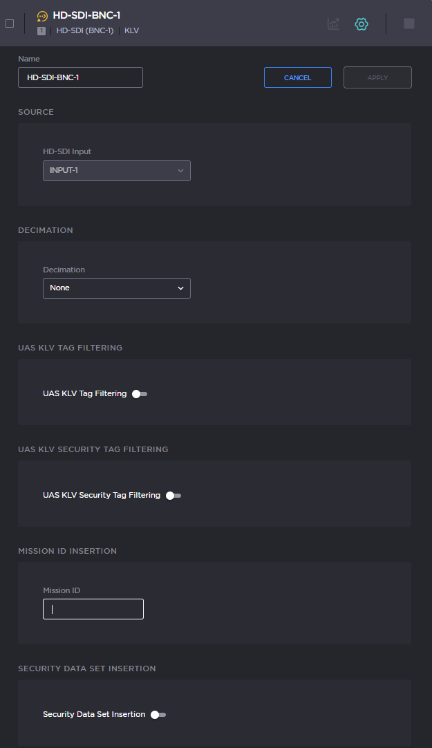 From the Metadata Details panel, you can define a small set of static KLV objects (i.e., mission IDs and security classification) for KLV and CoT metadata sources. This allows customers to modify erroneous or insert missing metadata within outbound TS steams. The following options are available: