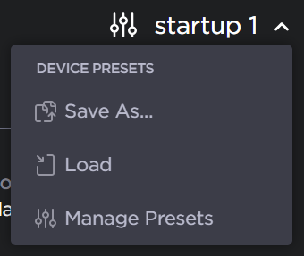 If the Preset Auto-Save function has been disabled, an amber warning indication will appear next to the Device Presets dropdown (in the header) on systems with unsaved configurations.