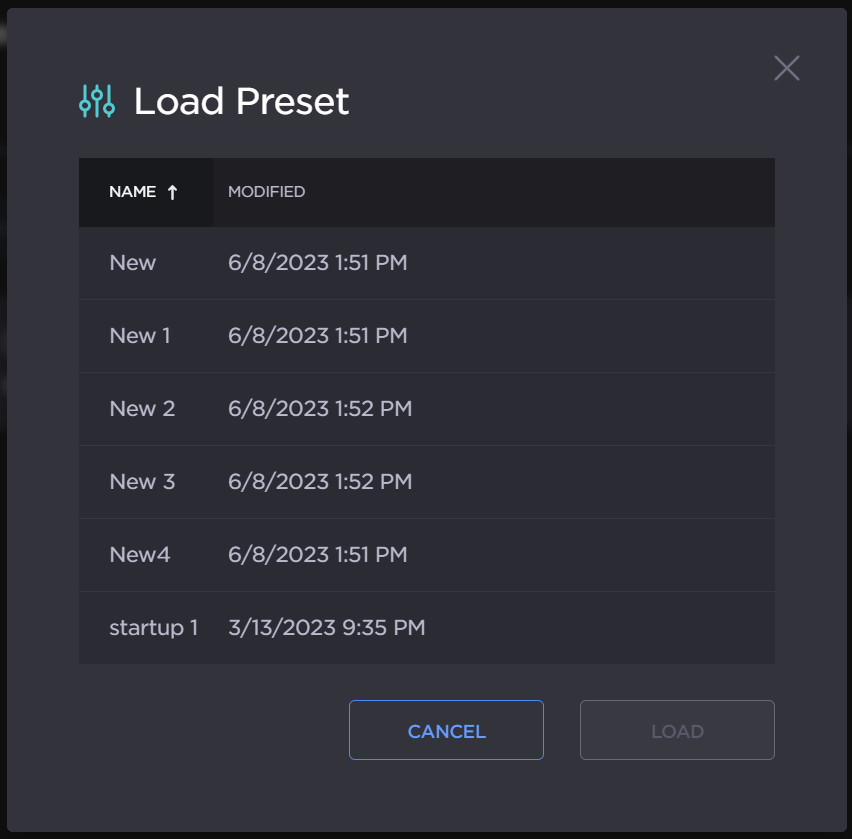 To load an existing preset into the current session, click the vertical ellipsis menu in the preset row and click Load.