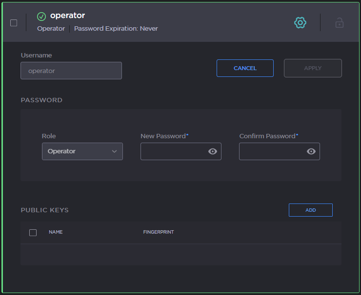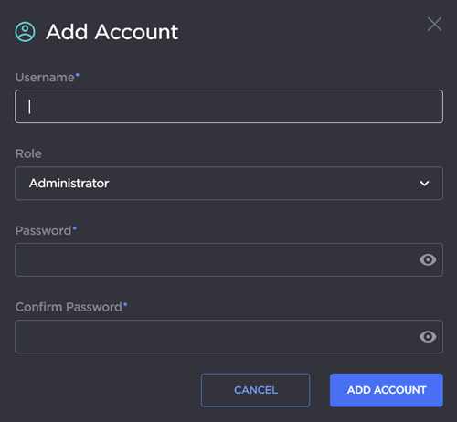 For security purposes, you cannot modify the Name or Role for an existing account.To reset the password of an existing account, type the new password into both the New Password and Confirm Password fields. For the allowed characters, see "Password Requirements" in Changing Your Password.
