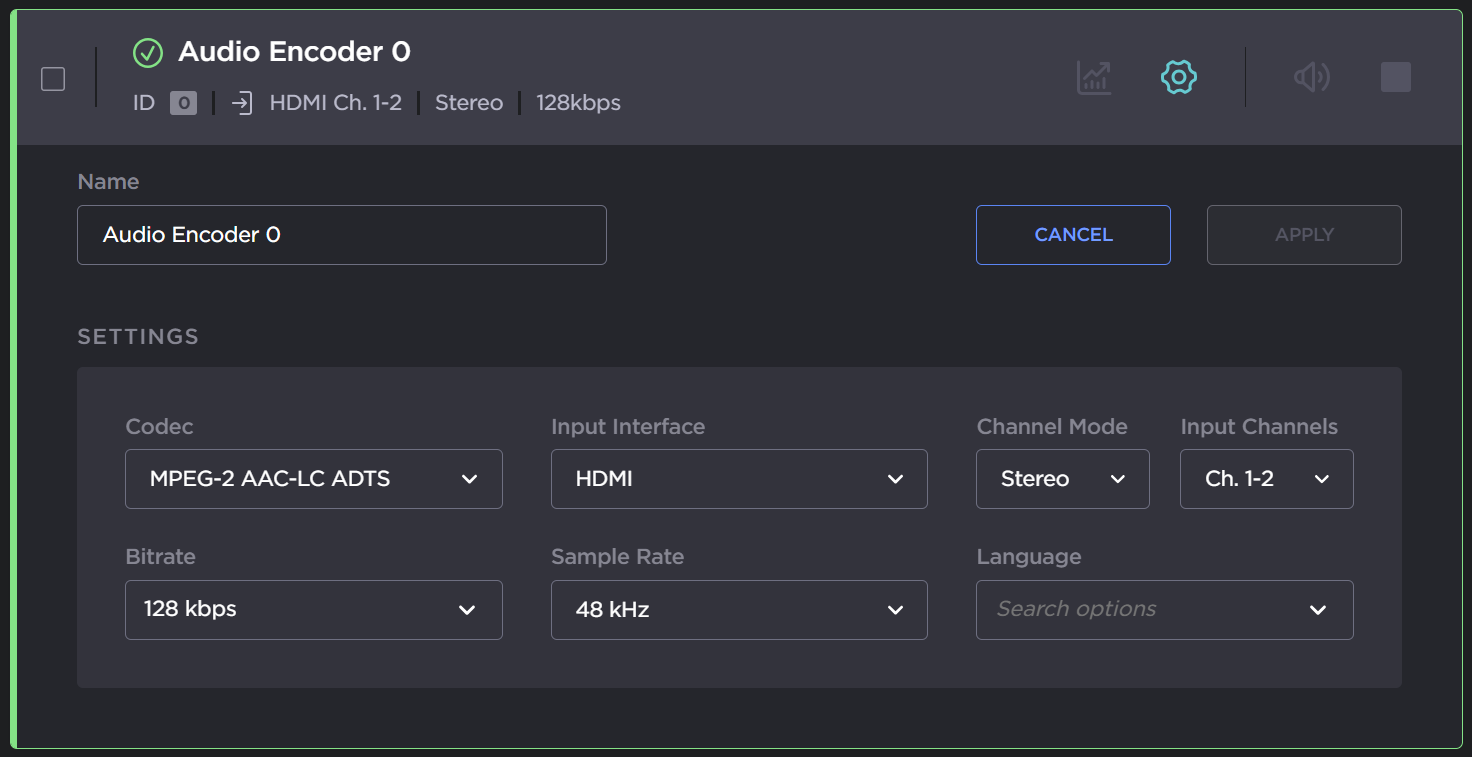 From the Audio Encoder Details panel, you can configure audio encoding settings such as the bitrate, encoding algorithm, and language for each encoder.