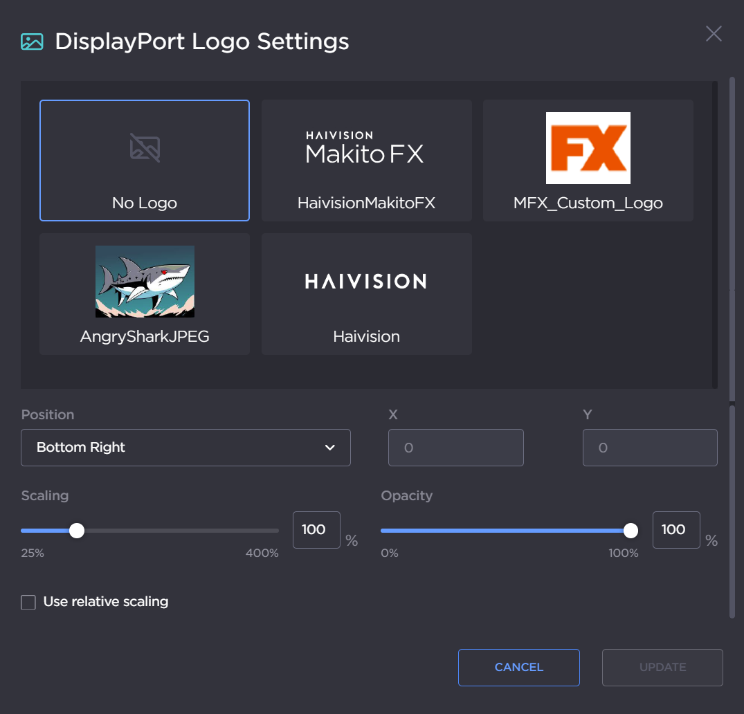 You can configure the size, transparency, and position of the logo. These settings will be saved in the current preset configuration. For more on presets, see Saving and Loading Presets.