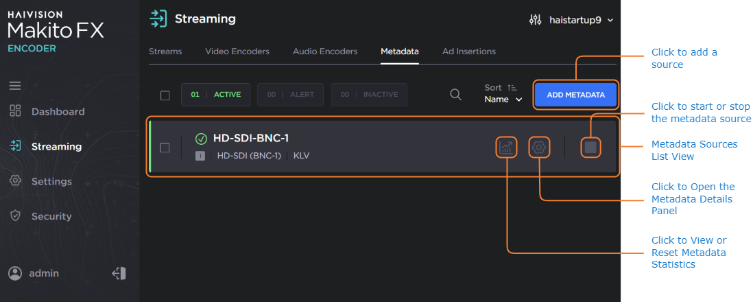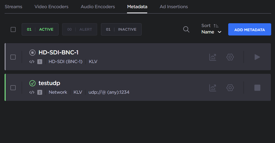 The Metadata List View opens, displaying the list of defined Metadata sources for the encoder. One KLV metadata source is provided by default (with an HD-SDI input).