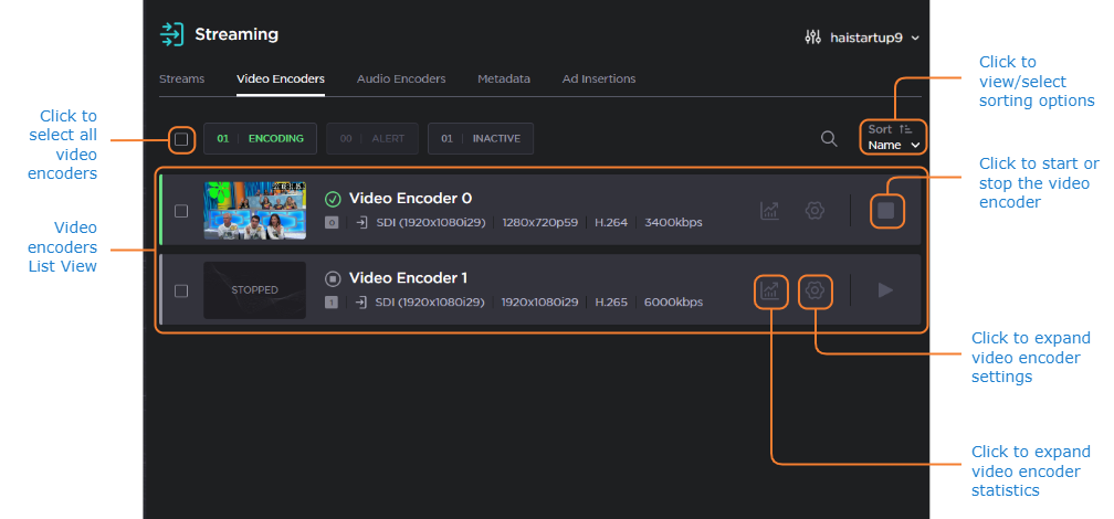 To change the status for multiple video encoders, check the check-boxes on each video encoder panel and click the Start or Stop buttons (as applicable) that appear above the list.