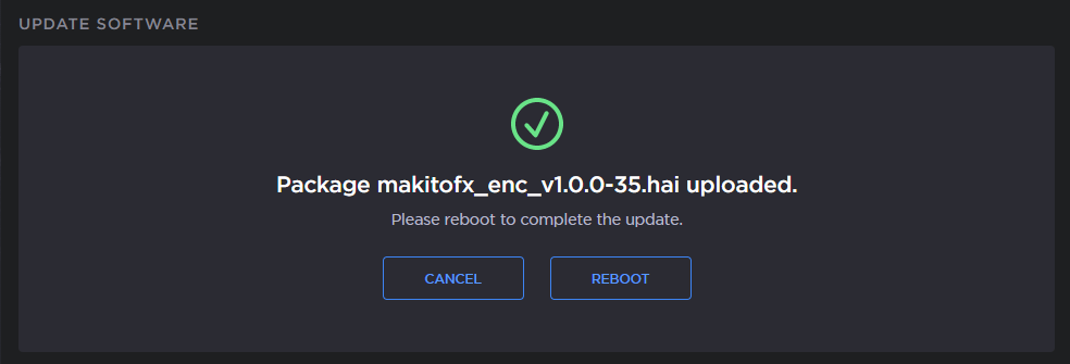 Exceptionally, if your Makito is operating behind a proxy or gateway with a default 30 second timeout, you will either receive an error or be prompted to upload the package again. If this occurs: