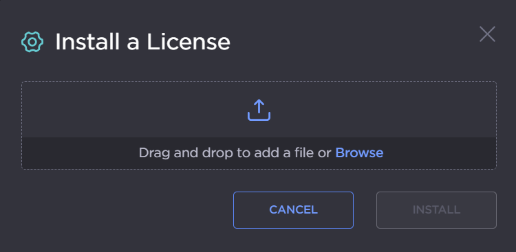 To install a license, click Install and then click Browse to select the file, or drag and drop the file in the Open File dialog box.
