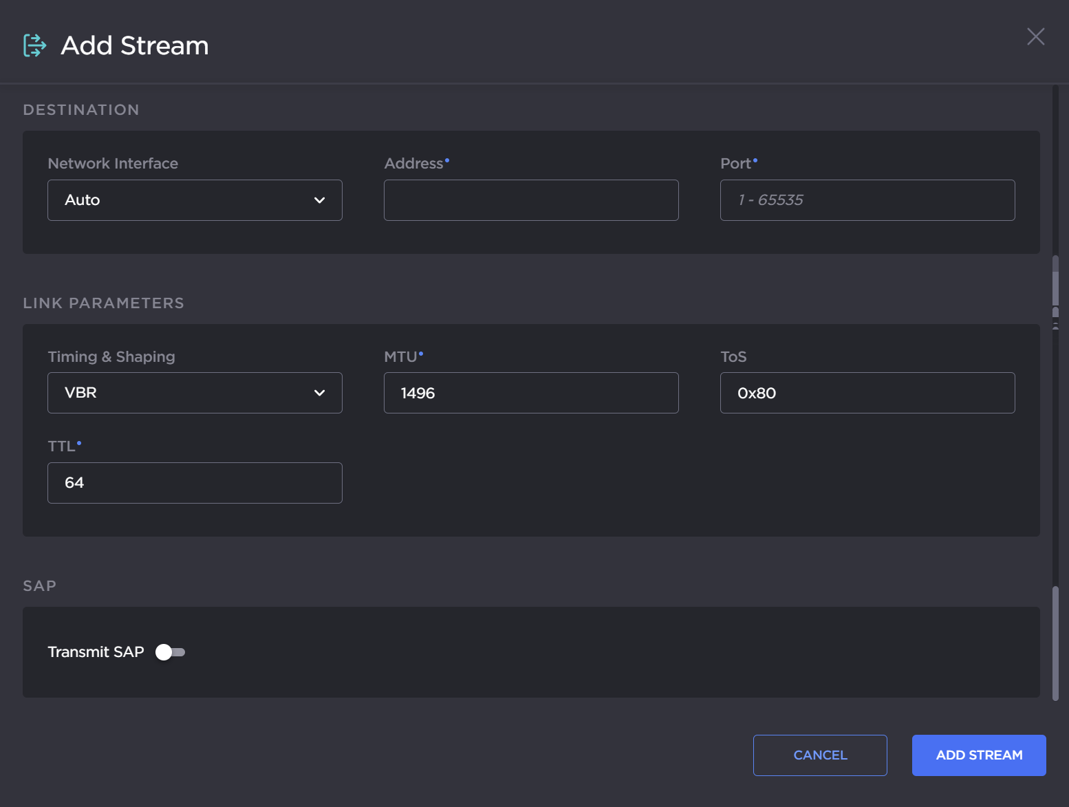Under Destination, select the network interface, and type in the IP Address and Port number, for example, multicast address