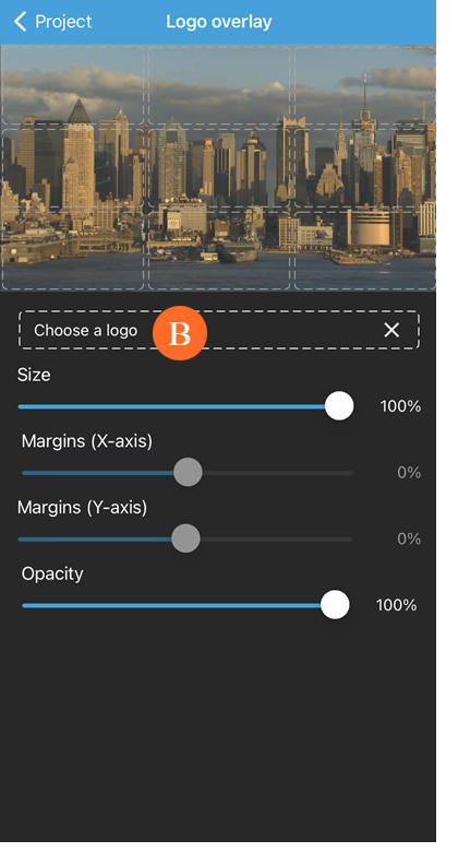 When you are done making changes, tap Project to return to the previous screen. A blue dot on the icon indicates that you have made changes to the logo overlay.