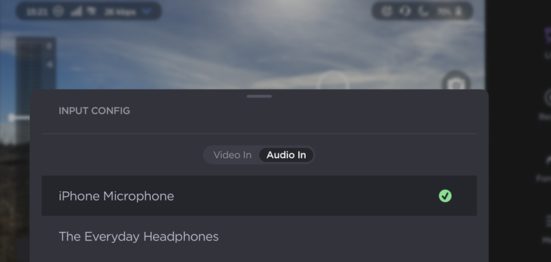 Tap the Audio In tab and select an input device. The currently selected input is indicated by a green checkmark.