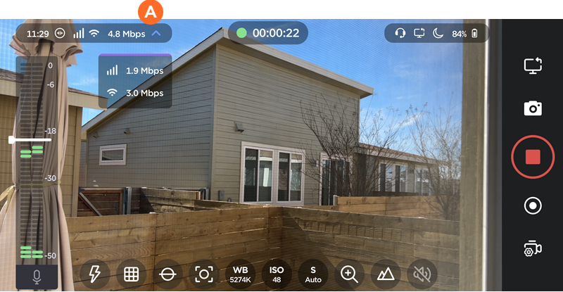 While live streaming, the network status and aggregate bitrate are displayed in the corner of the screen. Tap the drop-down arrow to view the bitrate across cellular and Wi-Fi connections, as shown in the following example.