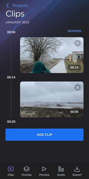 Tap Reorder to change the order of clips in your project. See Reordering Clips for more information.