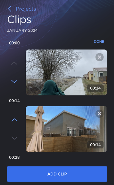 Tap a thumbnail to trim the clip or adjust its volume. See Trimming Clips.