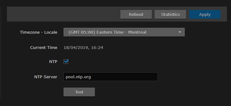 To validate that the NTP server is reachable, check the "NTP" checkbox and click Test (below the NTP server field).