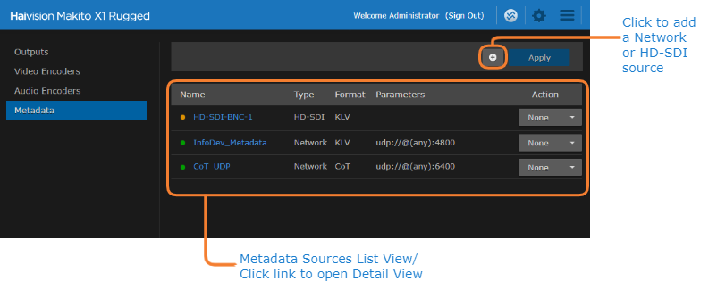 The Metadata List View opens, displaying the list of defined Metadata sources for the encoder. One SDI metadata source is provided by default.The Metadata List View displays the Status LED, source Name, Type, Format, and selected Parameters for each source.