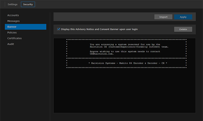 On the Administration page, click Security on the navigation bar and Banner on the sidebar. The Banner page opens. If banner text has been imported, it will be displayed here.
