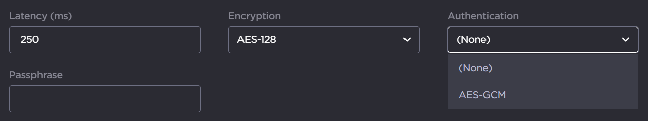Authentication options in Caller and Rendez-vous modes are None (default) or AES-GCM. Authentication options in Listener mode are Auto (default) or AES-GCM.