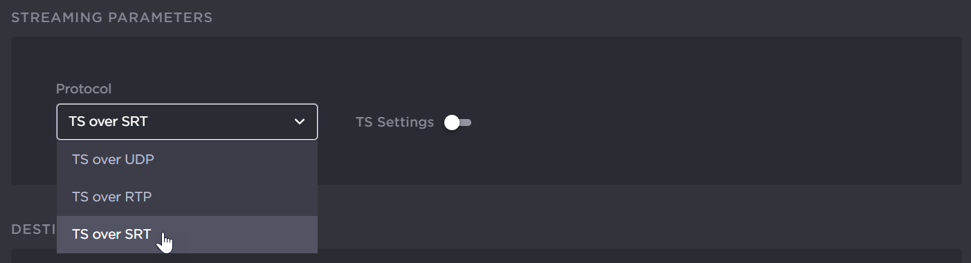 On the Stream Detail View, select TS over SRT for the Protocol.