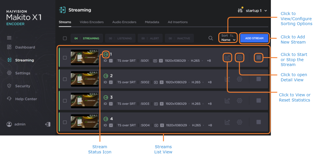 From the Streams page, you can create multiple output streams using the defined video encoders, audio encoders, and metadata (if applicable). Each output stream is configured independently. For details see: