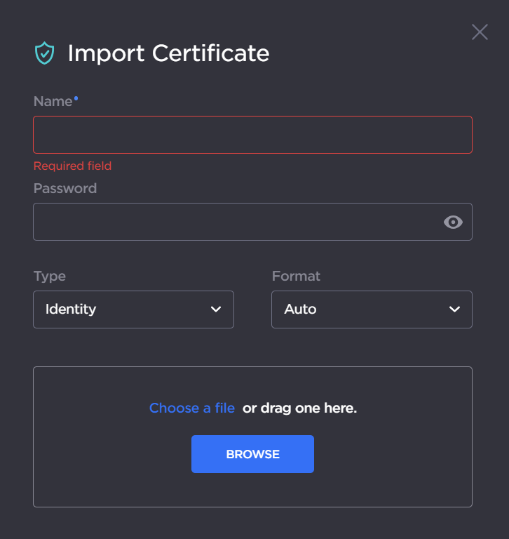 - On the Import Certificate dialog, type in the Name and complete the remaining fields. See "Import Identity or CA Certificate dialog" in "Certificate Settings" (link below).