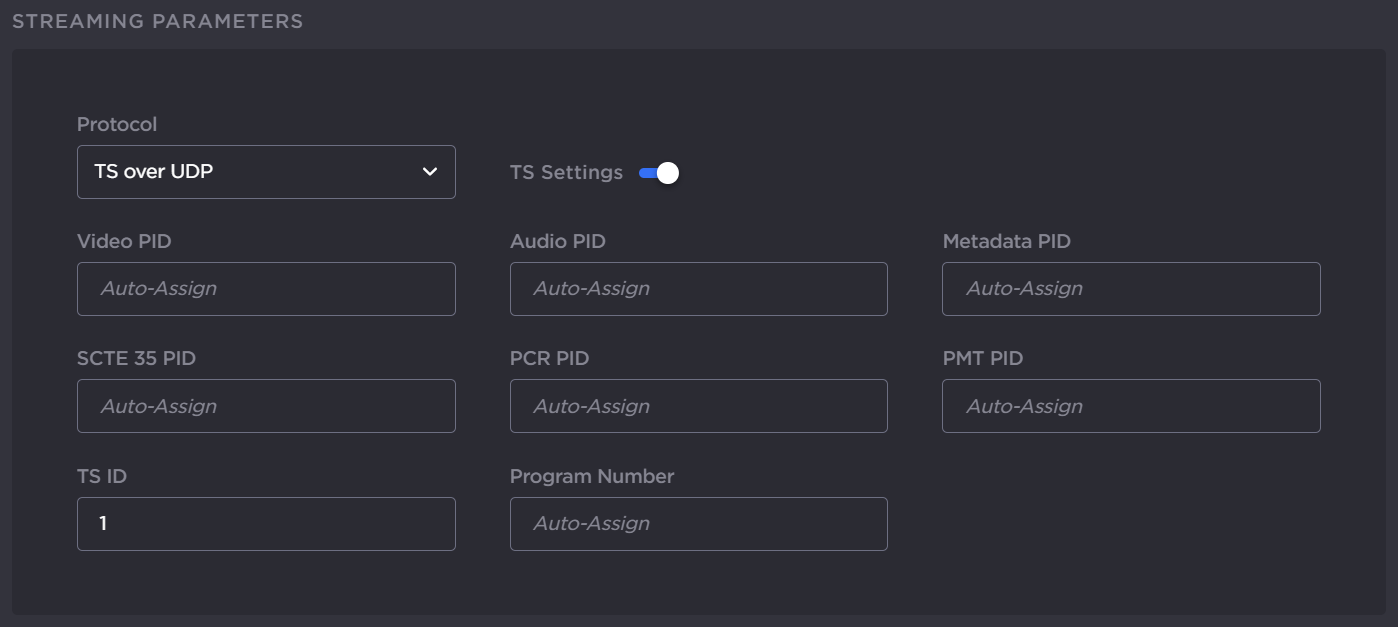 To configure the Transport Stream settings (for TS over UDP, RTP, or SRT), toggle TS Settings on and enter the necessary values.