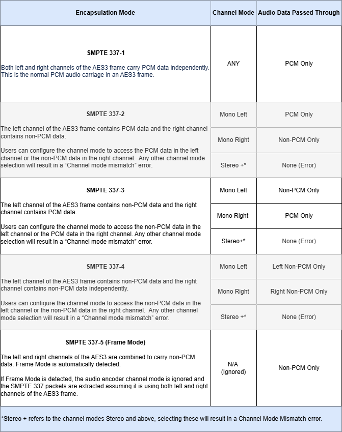 AC3 & E-AC3 AudioWhen passing through encoded AC3 or E-AC3 audio, the Channel Mode will determine what audio data is passed through, which varies based on the SMPTE 337 encapsulation mode used in the upstream source. These encapsulation modes can hold PCM Audio, non-PCM audio, or a combination of both. To prioritize AC3/E-AC3 (i.e. non-PCM audio) select the appropriate channel mode according to the table below. | ||