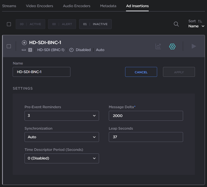 The Ad Insertions list view displays the name, type, timing, synchronization mode, and status of each ad source.Click the Start/Stop icon