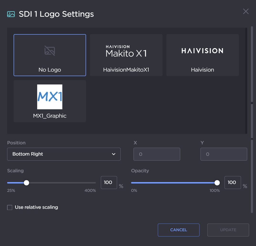 Administrators and operators can configure the Makito X1 to display one graphic file as a logo overlay in the encoded video.