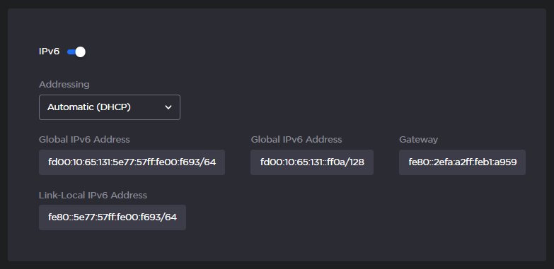 IPv6: - To configure IPv6 addressing, toggle the IPv6 button to On and select the Addressing option. Enter the new value(s) as required.