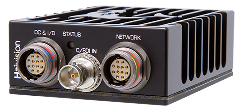 The Makito X1 Rugged enclosure provides rugged connectors for connecting the encoder's Power/Audio/Serial inputs, Video input, and Network interface, located on the front panel. There is one LED that indicates the power status.